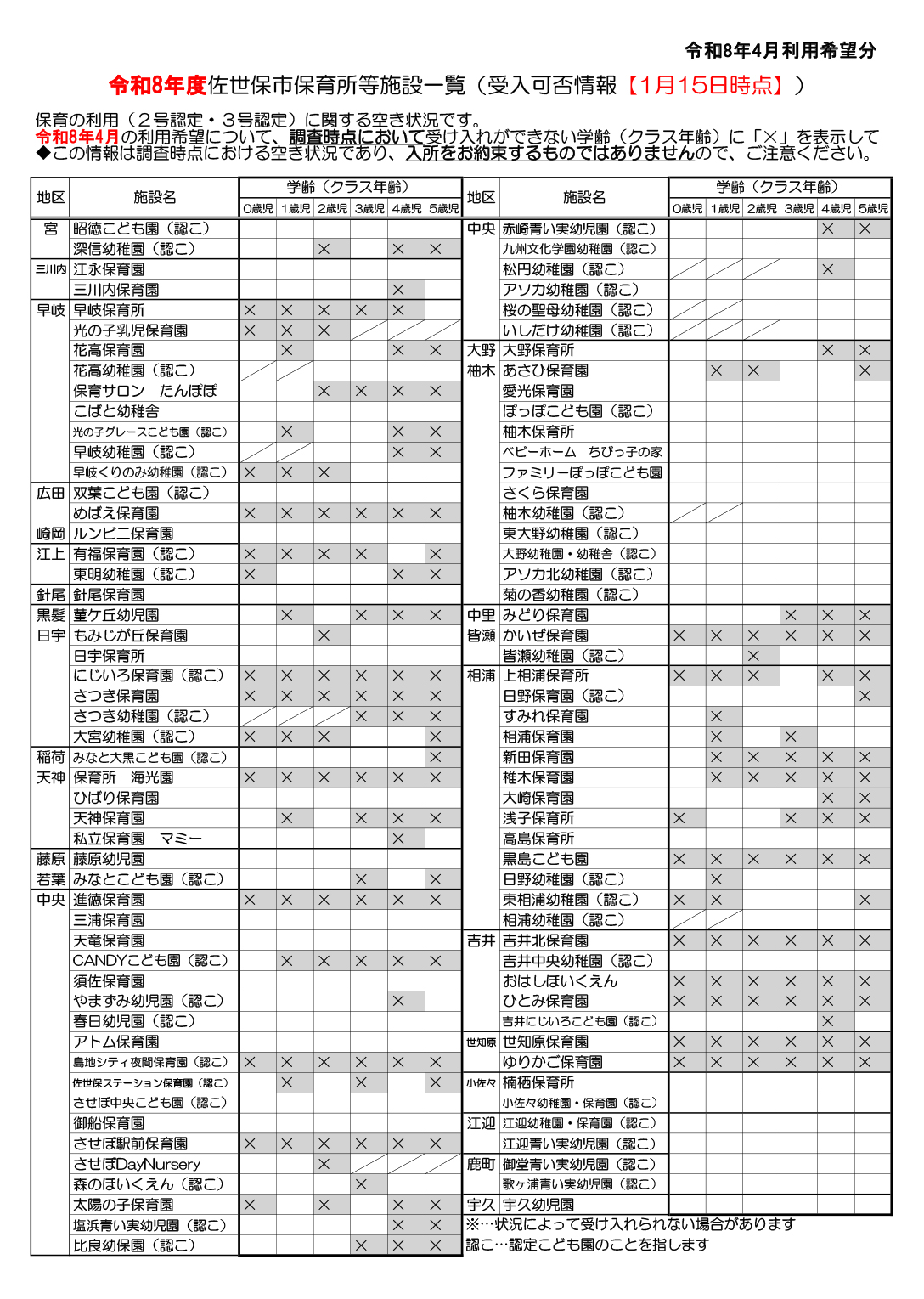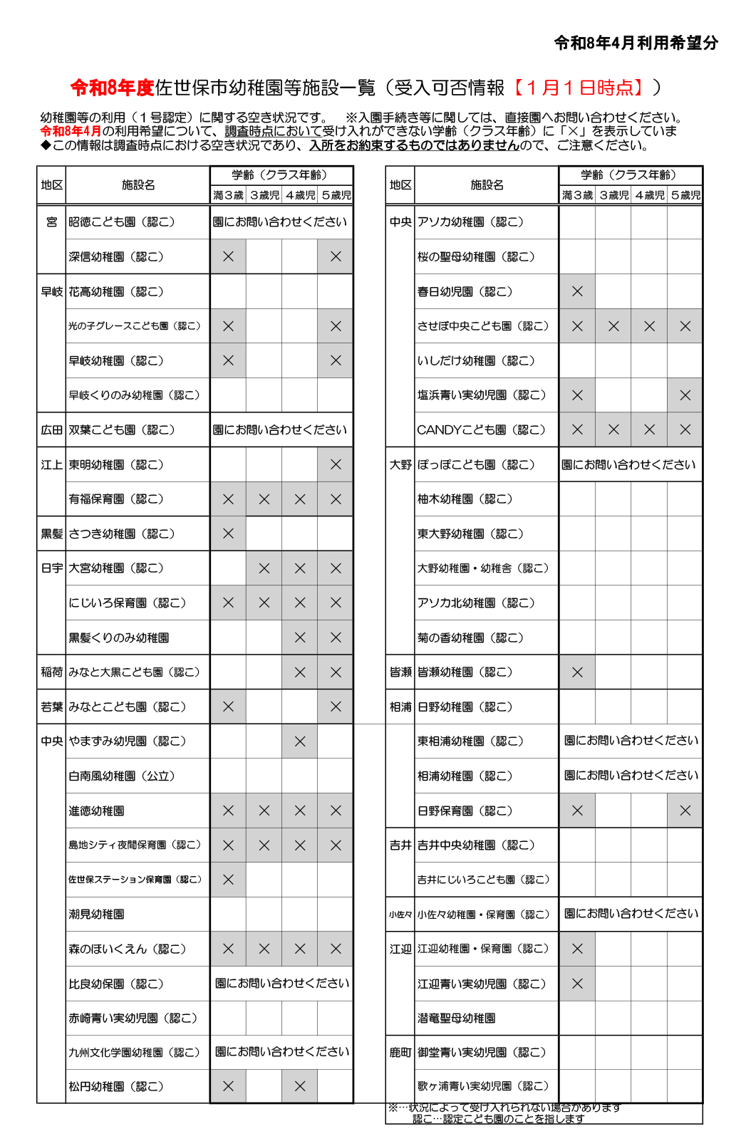 - 2026年4月の利用希望について、現時点において受け入れができない学齢(クラス年齢)に「×」を表示しています。