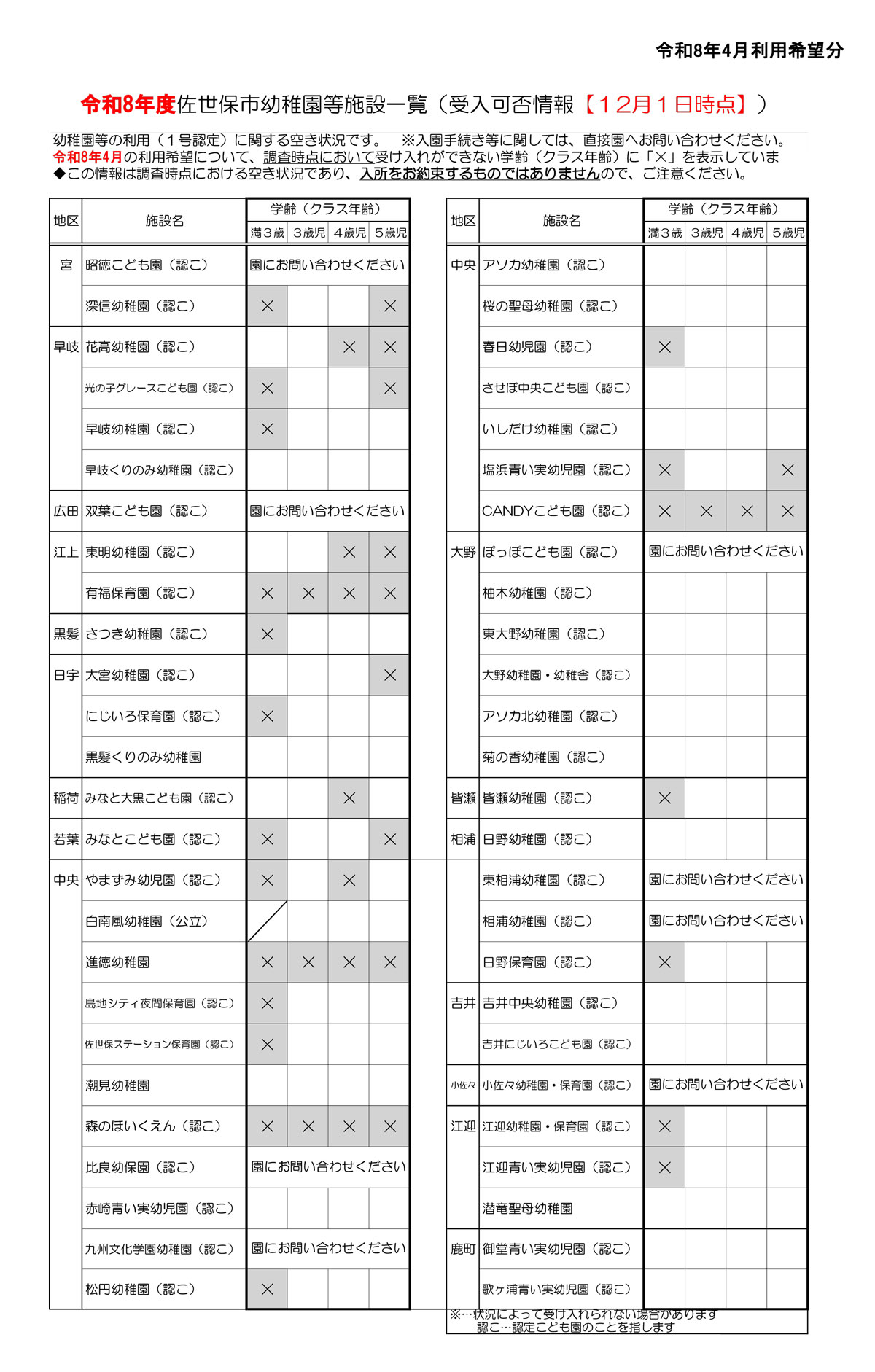 - 2026年4月の利用希望について、現時点において受け入れができない学齢(クラス年齢)に「×」を表示しています。