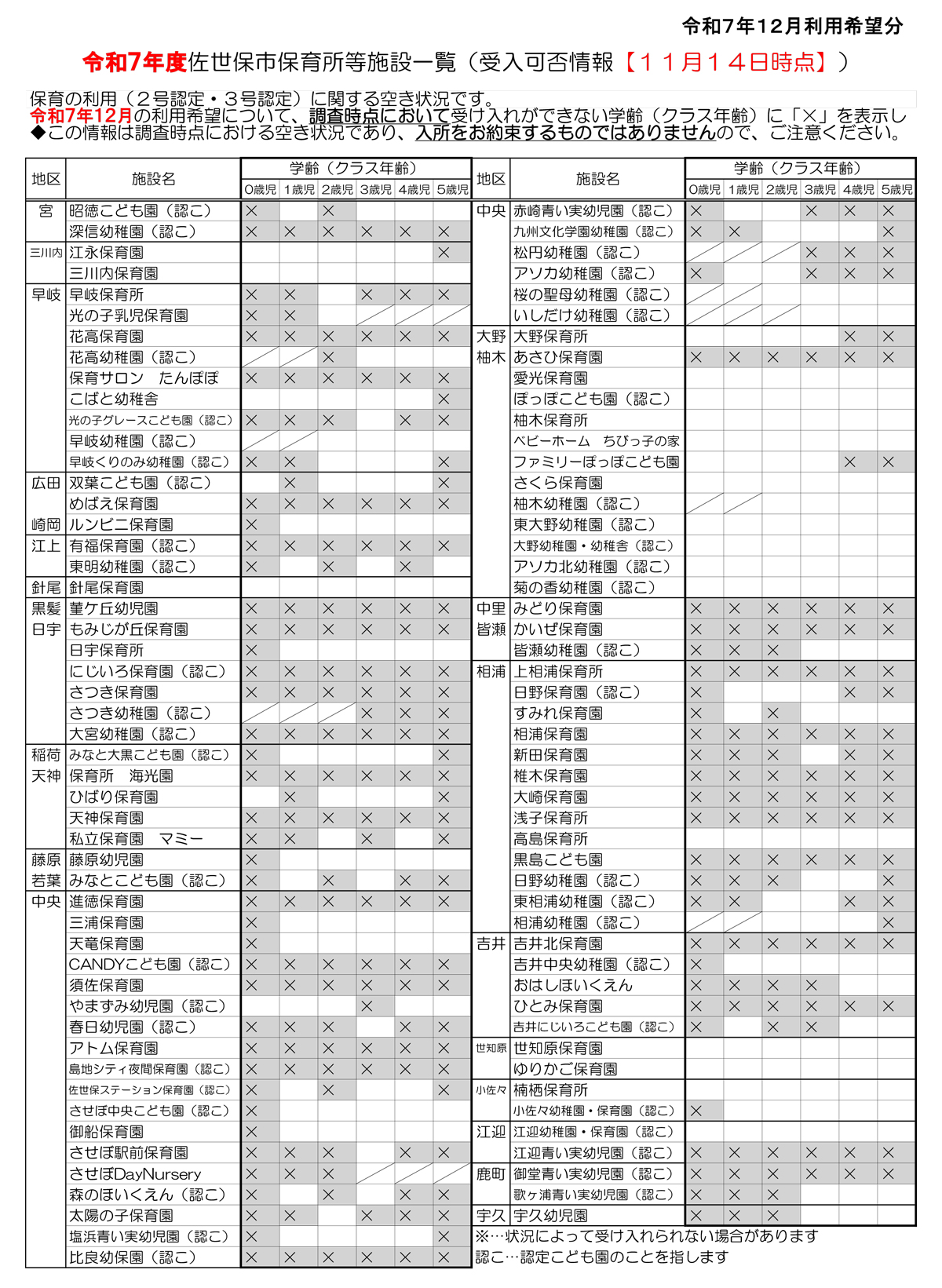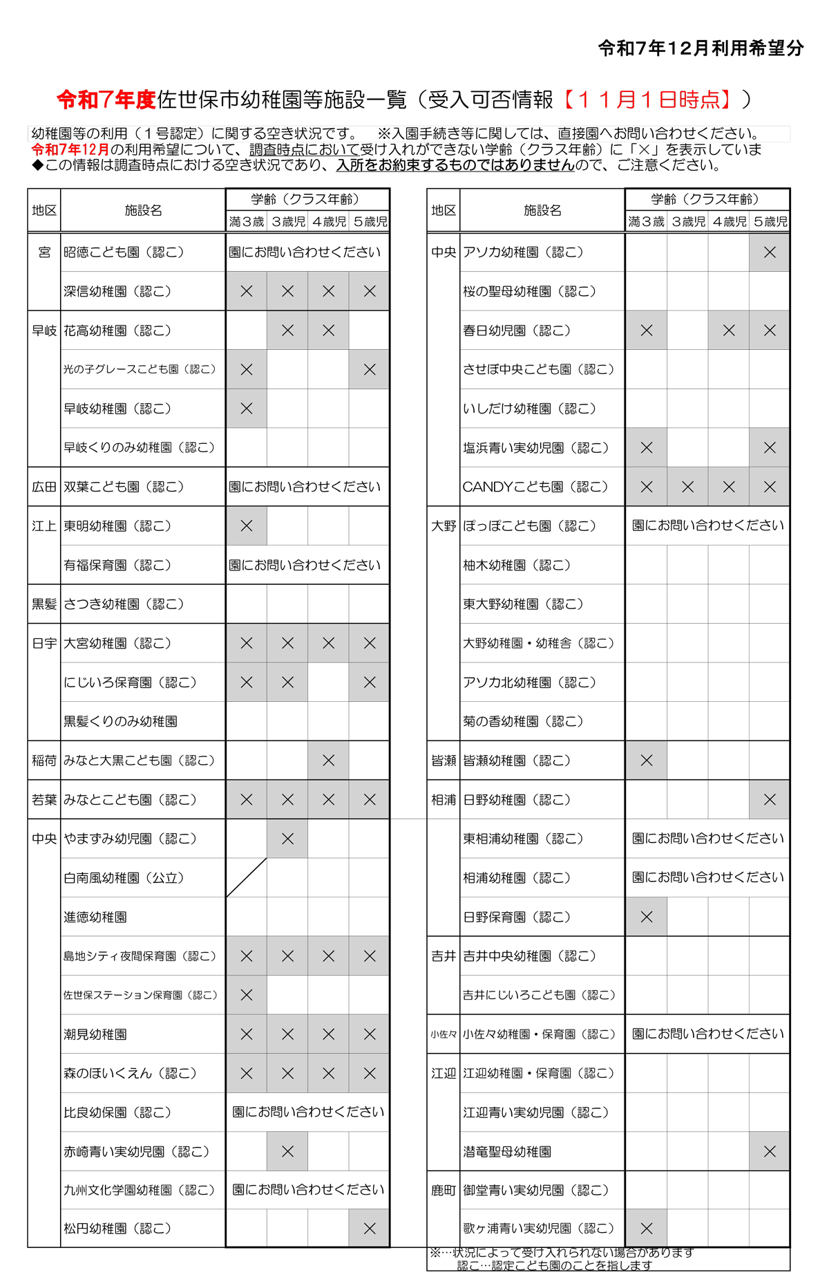 • 2025年12月の利用希望について、現時点において受け入れができない学齢(クラス年齢)に「×」を表示しています。