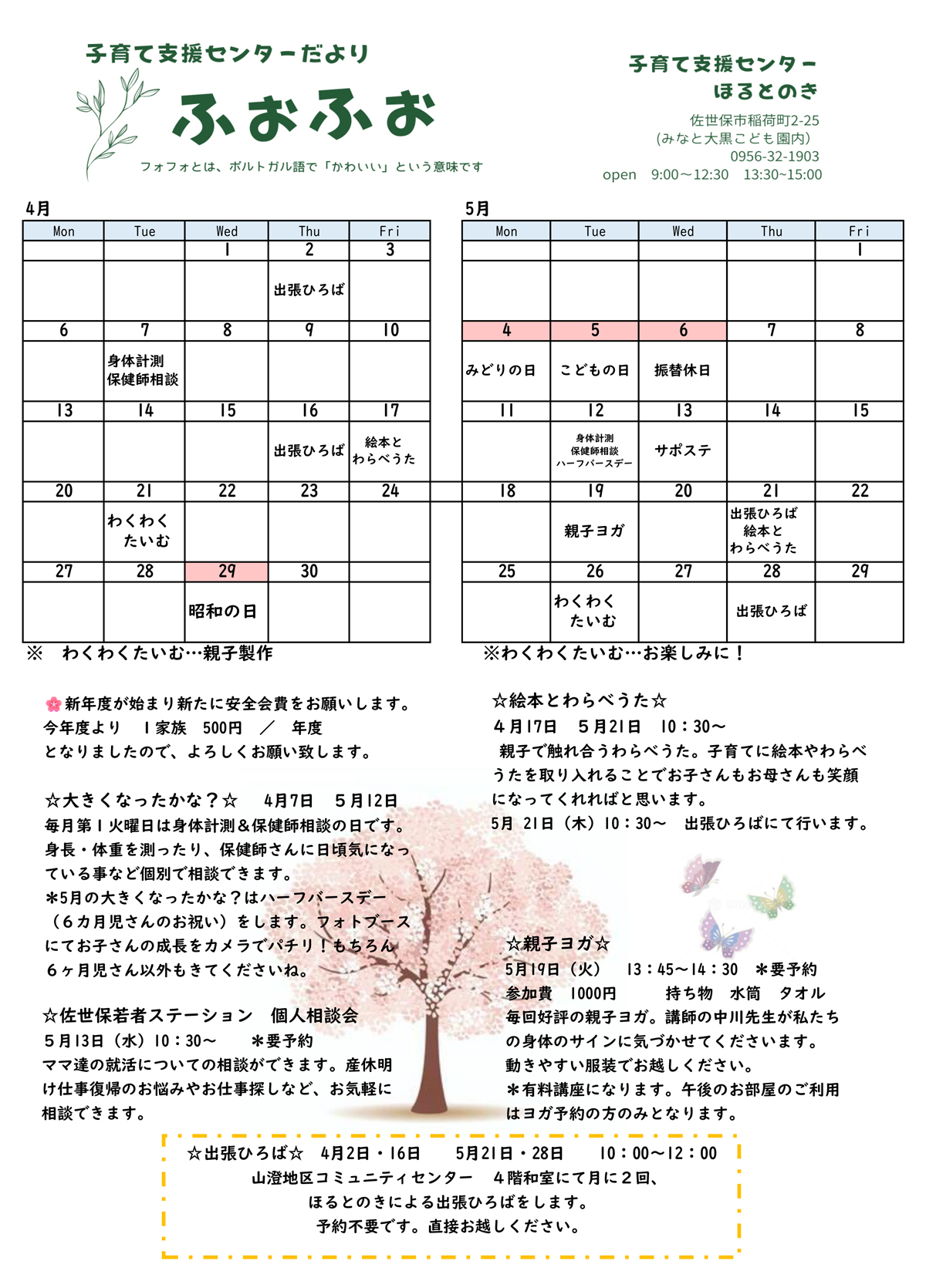 【内容】●身体測定●ハーフバースデーパーティパーティ●親子ヨガ●ベビーマッサージ●食育講座●公園で遊ぼう!●絵本とわらべうたの会●電話相談●絵本の貸し出し●おやこクラフトなど