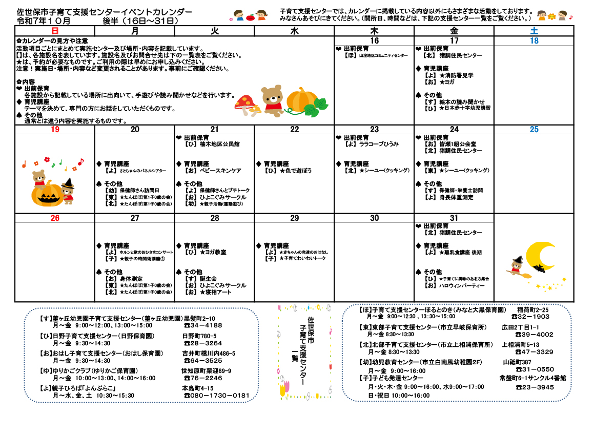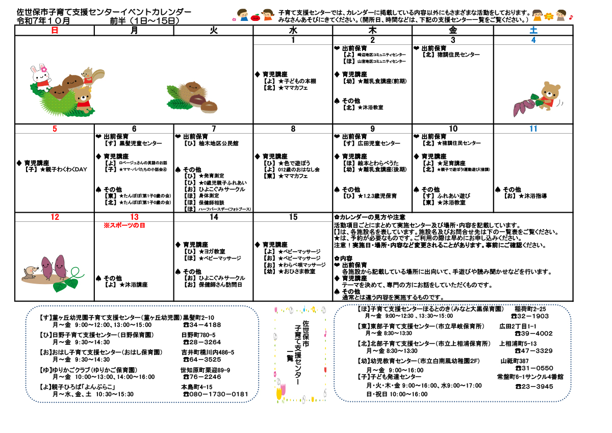 佐世保市のある子育て支援センターが発行している、イベントカレンダーです♪初めてママもパパも安心♪ 0才~就学前のお子さんも持つ親子が遊べる場所ですよ。担当の保育士さんもいるので、きょうだいでのびのび遊 ...