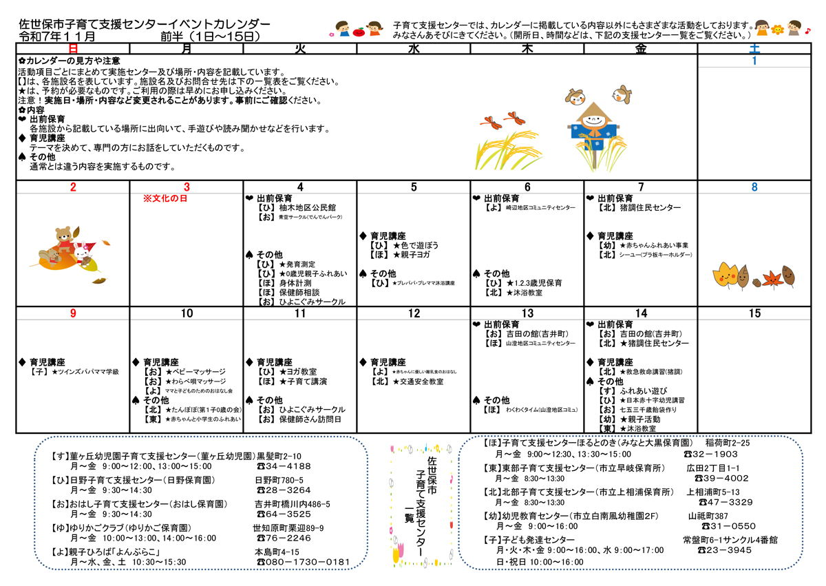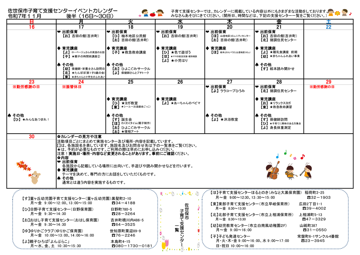 佐世保市のある子育て支援センターが発行している、イベントカレンダーです♪初めてママもパパも安心♪ 0才~就学前のお子さんも持つ親子が遊べる場所ですよ。担当の保育士さんもいるので、きょうだいでのびのび遊 ...