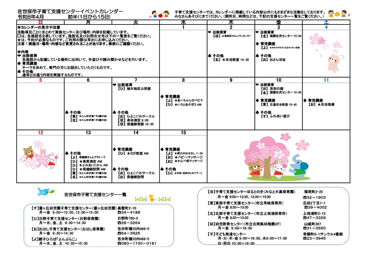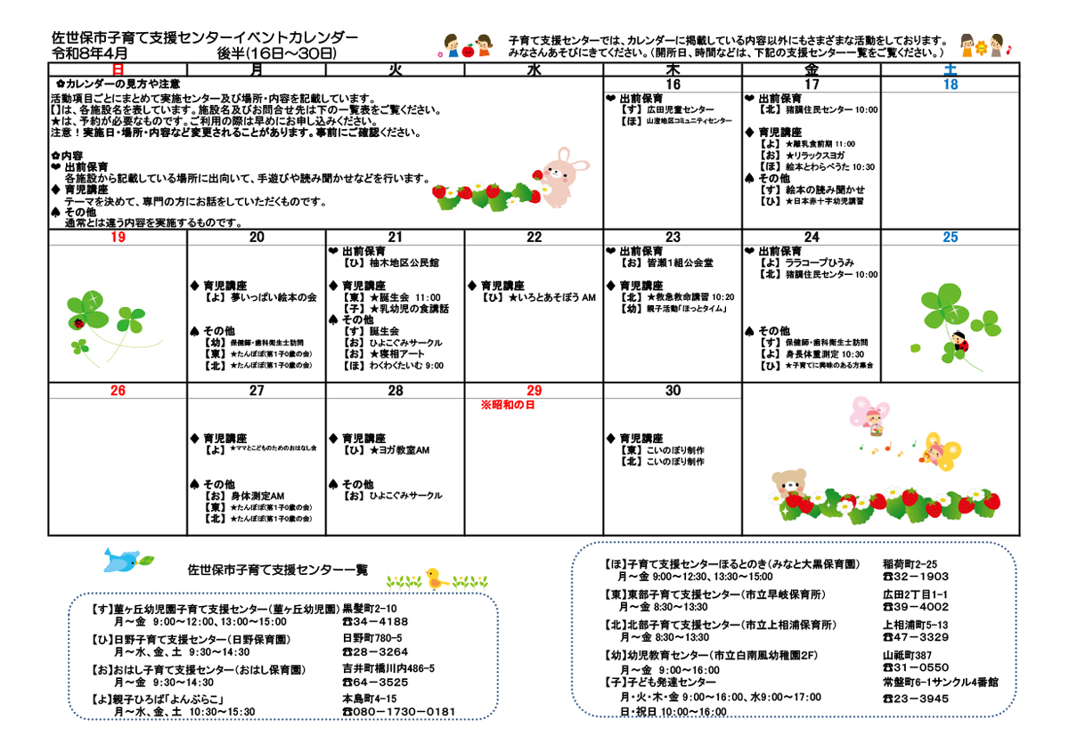 佐世保市のある子育て支援センターが発行している、イベントカレンダーです♪初めてママもパパも安心♪ 0才~就学前のお子さんも持つ親子が遊べる場所ですよ。担当の保育士さんもいるので、きょうだいでのびのび遊 ...