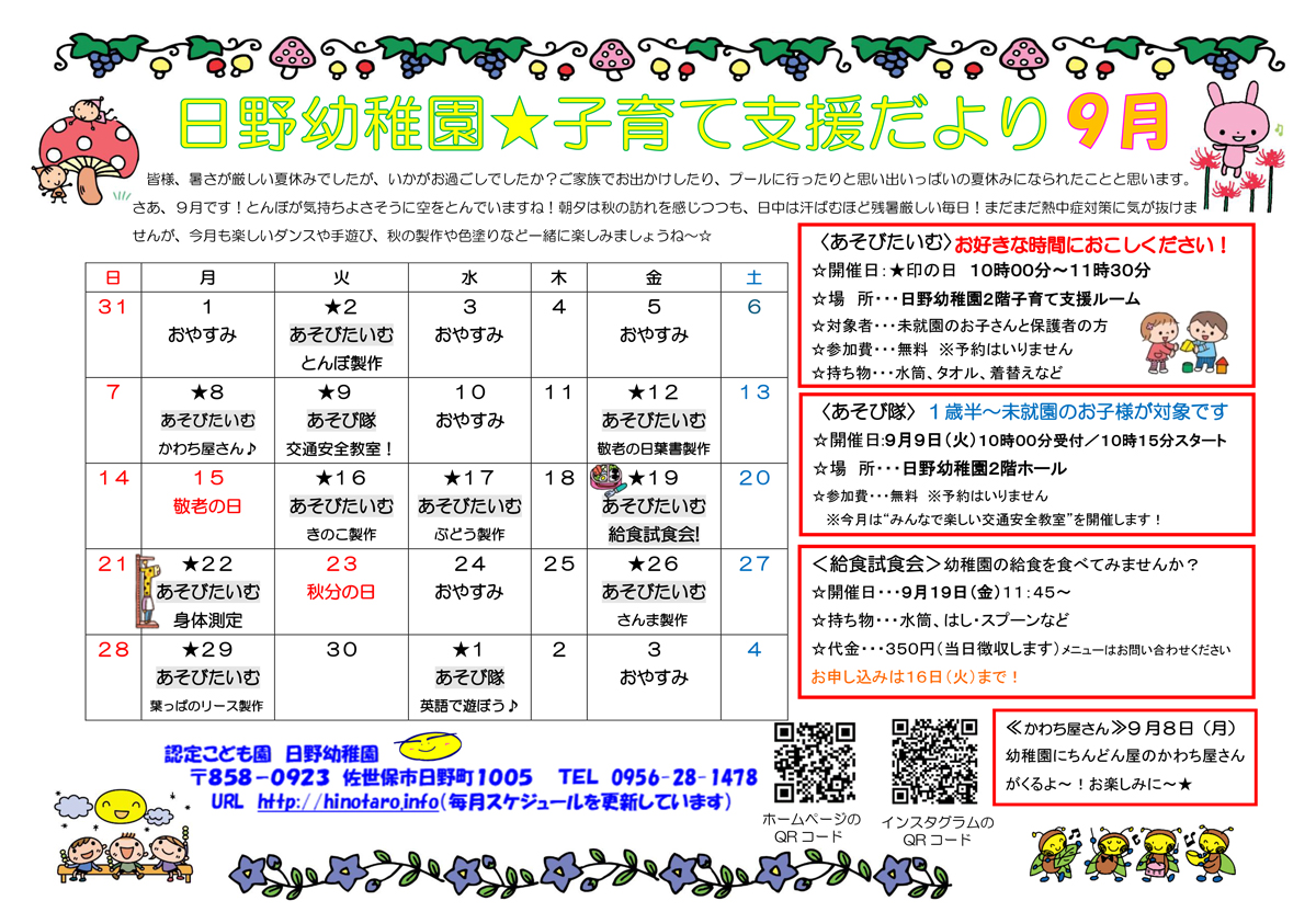 • スケジュールは幼稚園の行事等により変更する場合があります。園のInstagramまたはホームページでチェックしてね♪