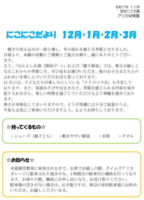 佐世保市光月町にある認定こども園 アソカ幼稚園では、未就園児の親子対象に、季節ごとの楽しいお遊びや、親子で楽しめるふれあい遊びに加えて体育教室、英語あそびなど、専門の先生にもおいでいただき、幅広く楽し ...