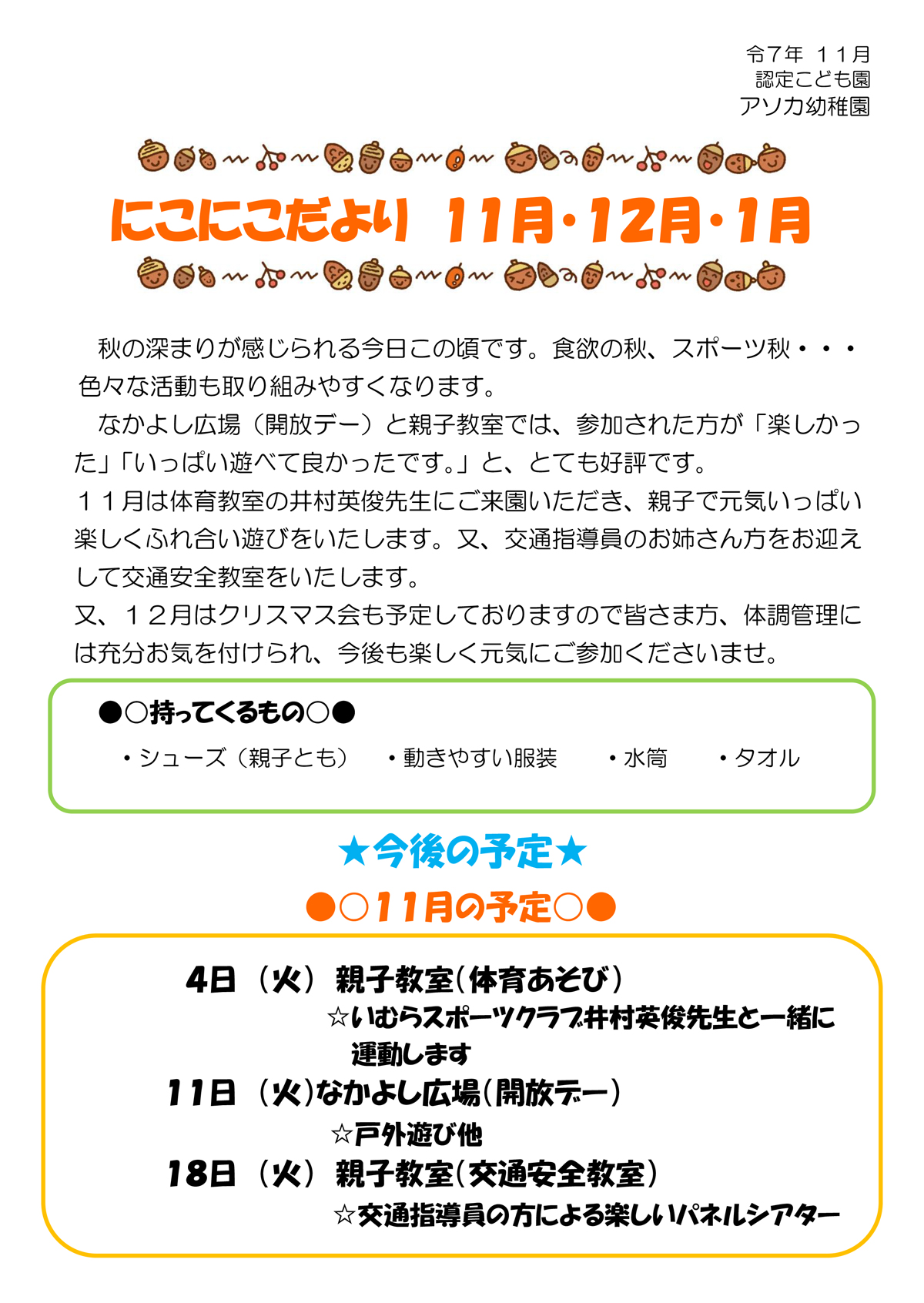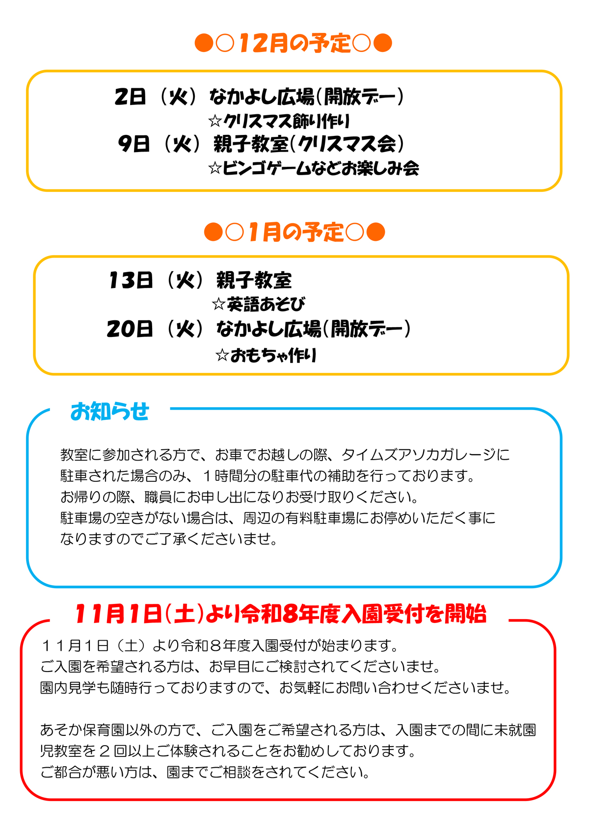 佐世保市光月町にある認定こども園 アソカ幼稚園では、未就園児の親子対象に、季節ごとの楽しいお遊びや、親子で楽しめるふれあい遊びに加えて体育教室、英語あそびなど、専門の先生にもおいでいただき、幅広く楽し ...