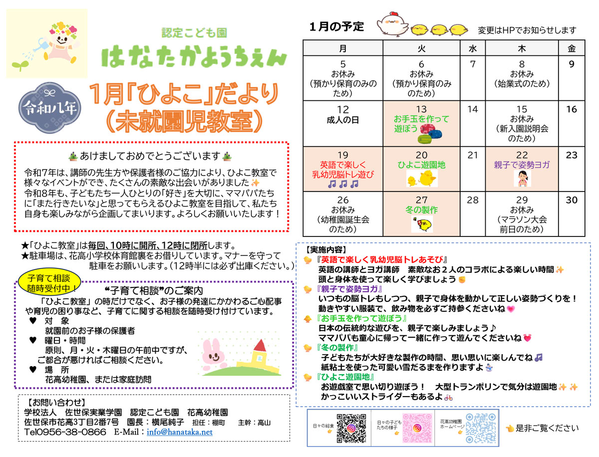 佐世保市花高3丁目にある認定こども園 花高幼稚園では、未就園児の親子対象に遊び場を提供されています。内容は、英語教室をはじめ、季節を感じられるイベントなど…。詳しくは、園にお電話してみてくださいね♪