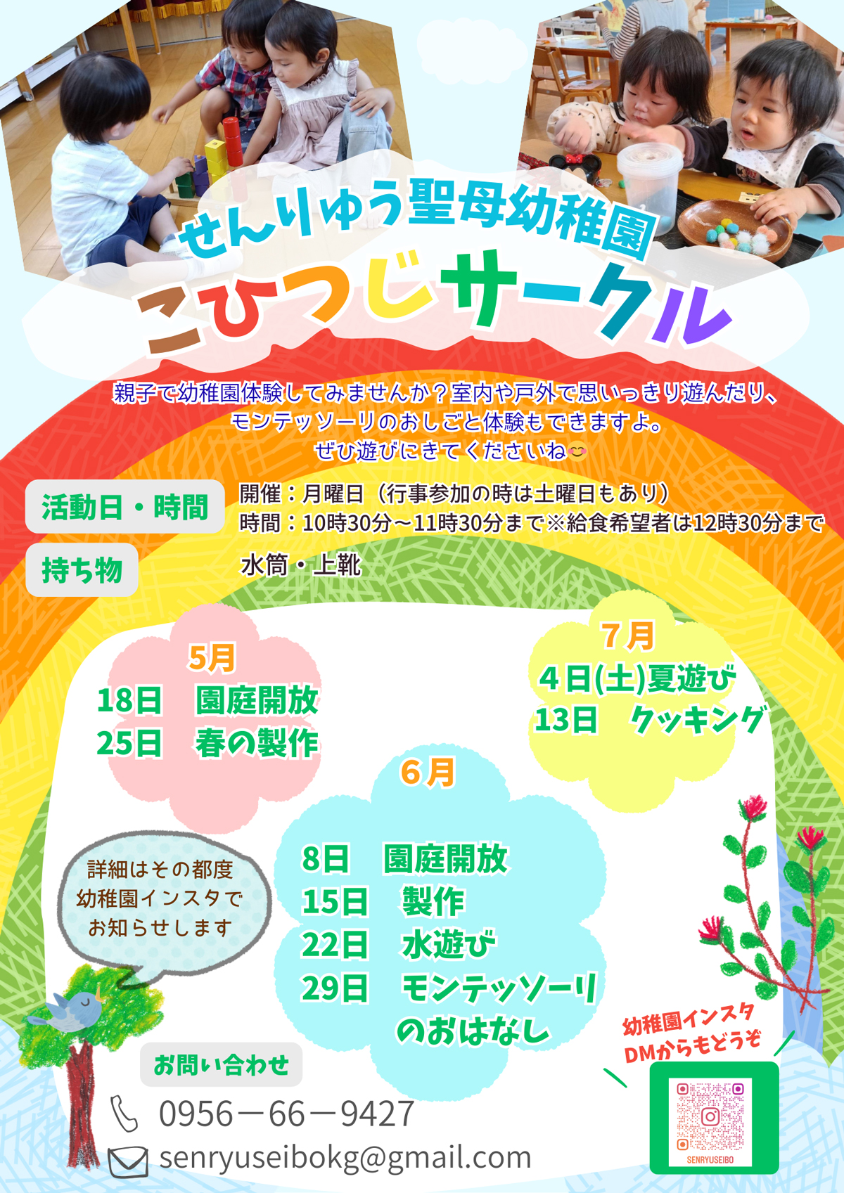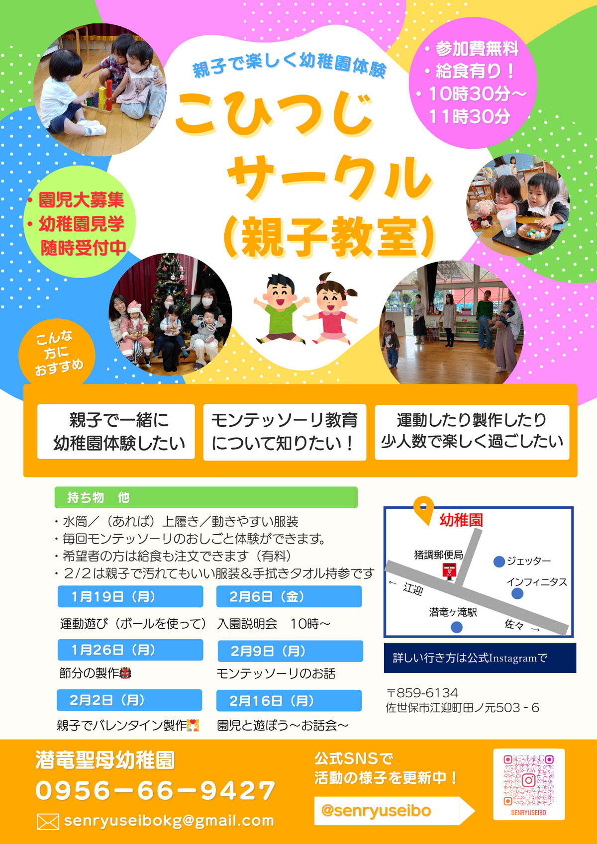佐世保市江迎町にある潜竜聖母幼稚園では、未就園児の親子対象に遊び場を提供されています。初めて参加されたい方は、園にお電話してみてくださいね♪