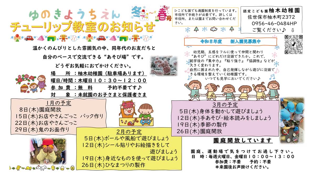佐世保市柚木町にある認定こども園 柚木幼稚園では、未就園児の親子対象に遊び場を提供されています。内容は様々。毎週火曜&金曜日は園庭開放もされていますよ。詳しくは、園にお電話してみてくださいね♪