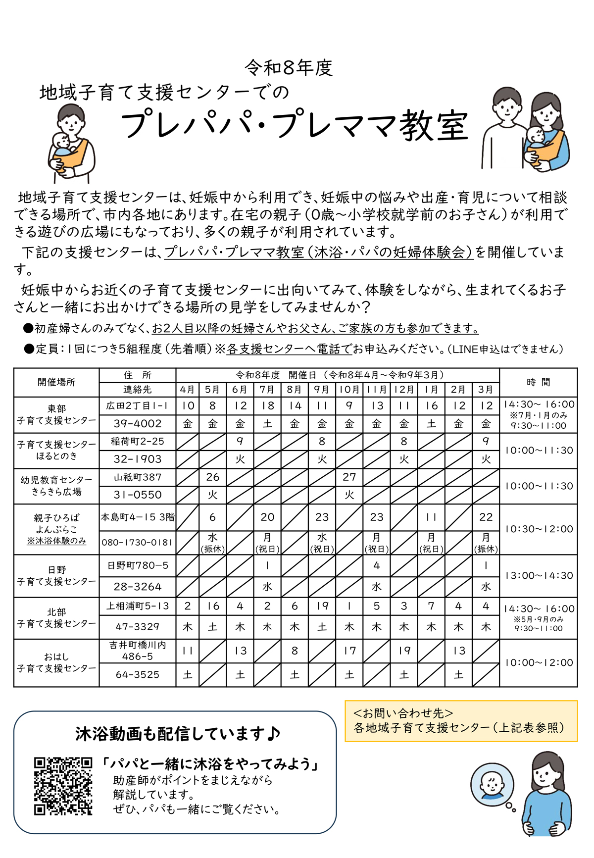 開催場所および日程の詳細ついては下記のチラシをご参照いただき、希望する子育て支援センターに直接お電話でお申し込みください。(予約枠に限りがございますので、予定がわかり次第、お早めにお申し込みください。
