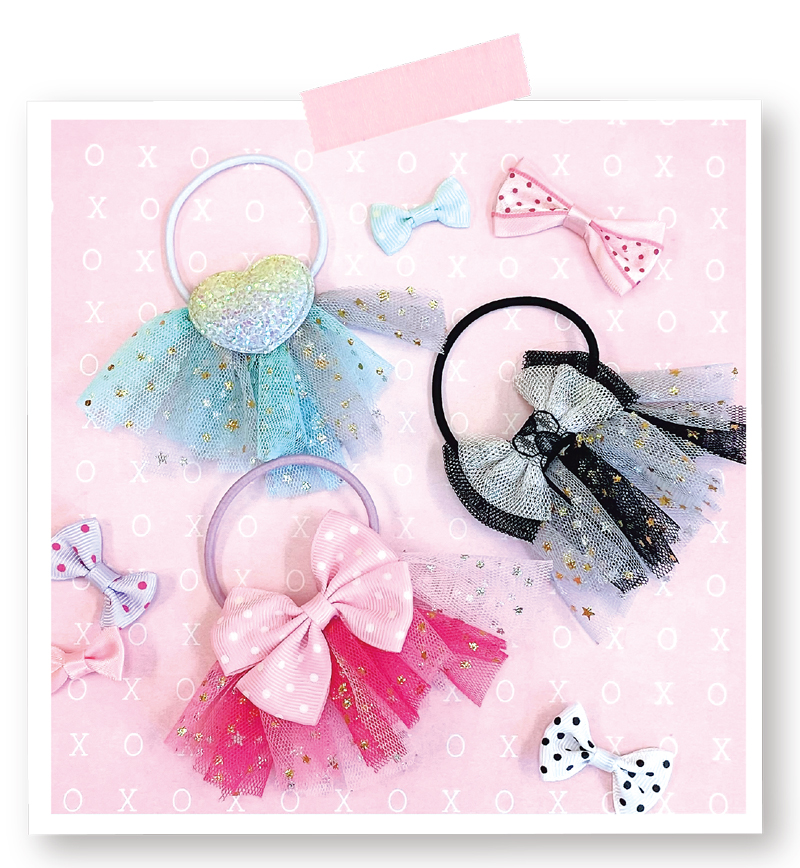 たくさんあるカラフルなチュールとリボン、デコパーツを選んで、かわいいヘアゴムorヘアピンを作ってみましょう♪3つ作る予定です(^^♪