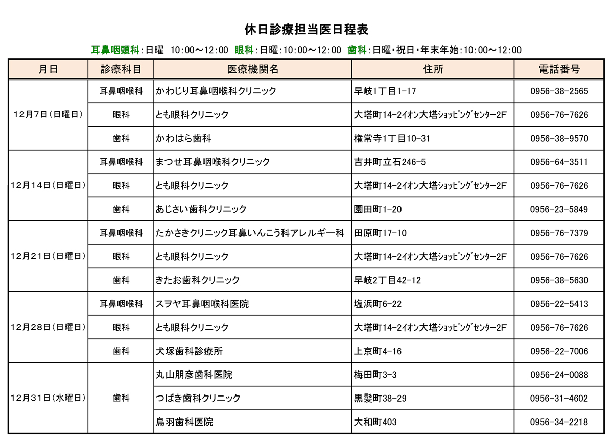 2025年12月「耳鼻咽喉科・眼科・歯科」休日診療担当医