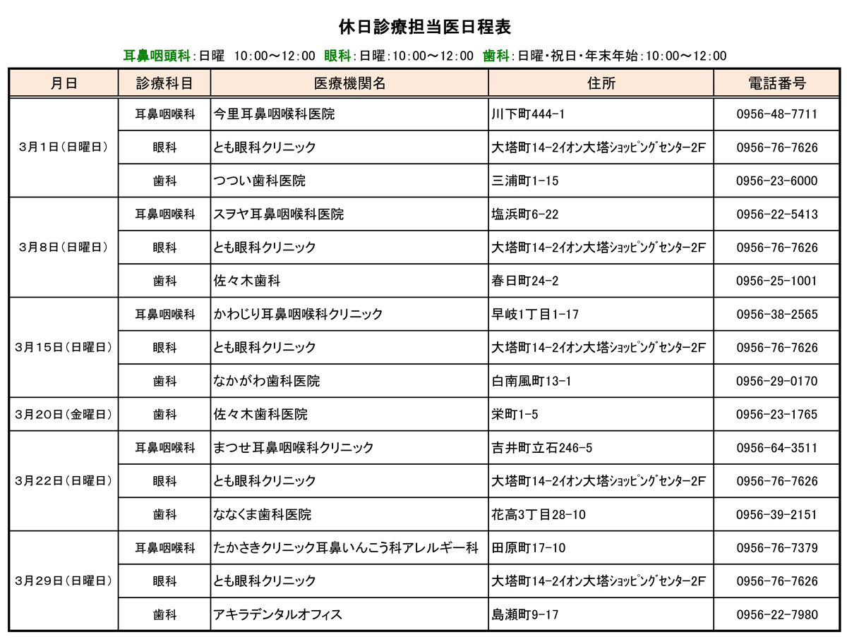 2026年3月「耳鼻咽喉科・眼科・歯科」休日診療担当医