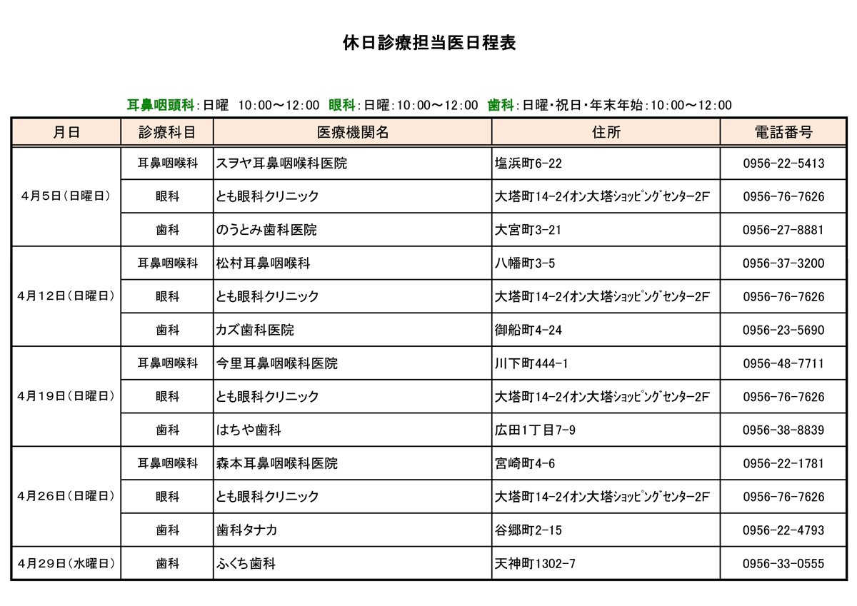 2026年4月「耳鼻咽喉科・眼科・歯科」休日診療担当医