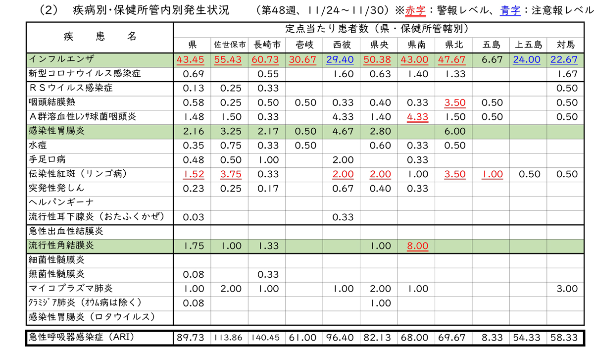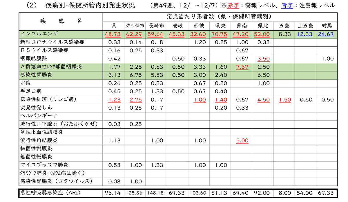 2025年第49週(12月1日~12月7日)の佐世保市のインフルエンザの定点当たり報告数は62.29と先週の55.43から増加し、3週連続で警報レベルの報告数となりました。