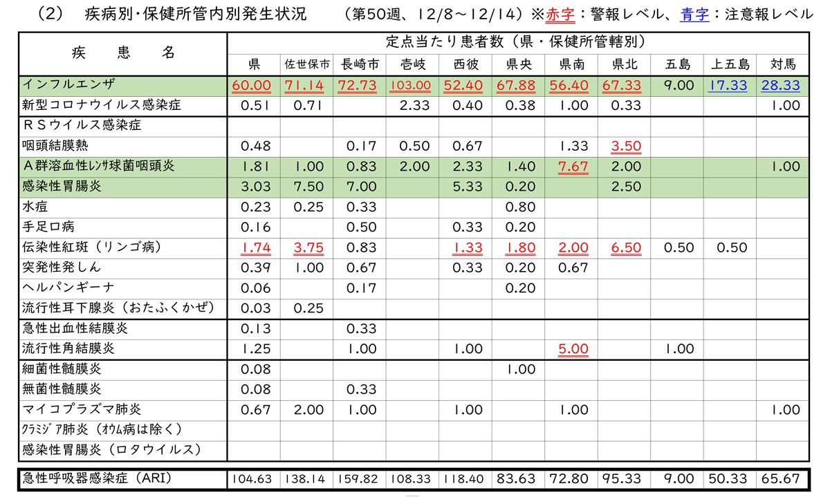 2025年第50週(12月8日~12月14日)の佐世保市のインフルエンザの定点当たり報告数は71.14と先週の62.29から増加し、4週連続で警報レベルの報告数となりました。