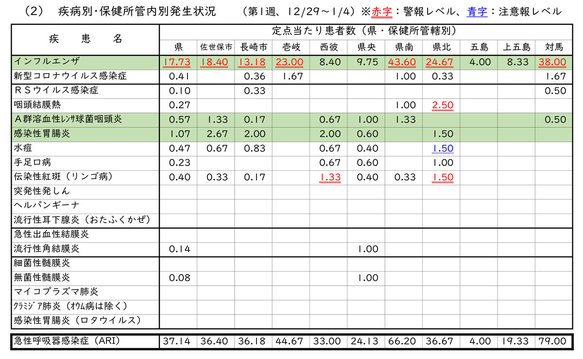 2026年第1週(12月29日~1月4日)の佐世保市のインフルエンザの定点当たり報告数は18.40となりました。今回の報告数は、対象期間が年末年始と重なっており、多くの医療機関が休診した影響で減少したところもありますが、未だ警報レベルの報告数となっています。