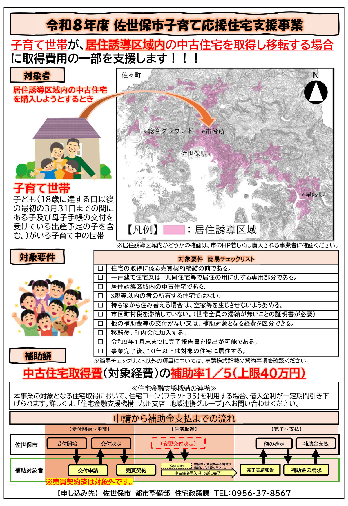 中古住宅の流通促進や持続可能な市民生活の確保、子育て世帯の住環境の向上を目的として、子育て世帯が、居住誘導区域内の中古住宅を取得して居住する場合に取得費用の一部を補助します。