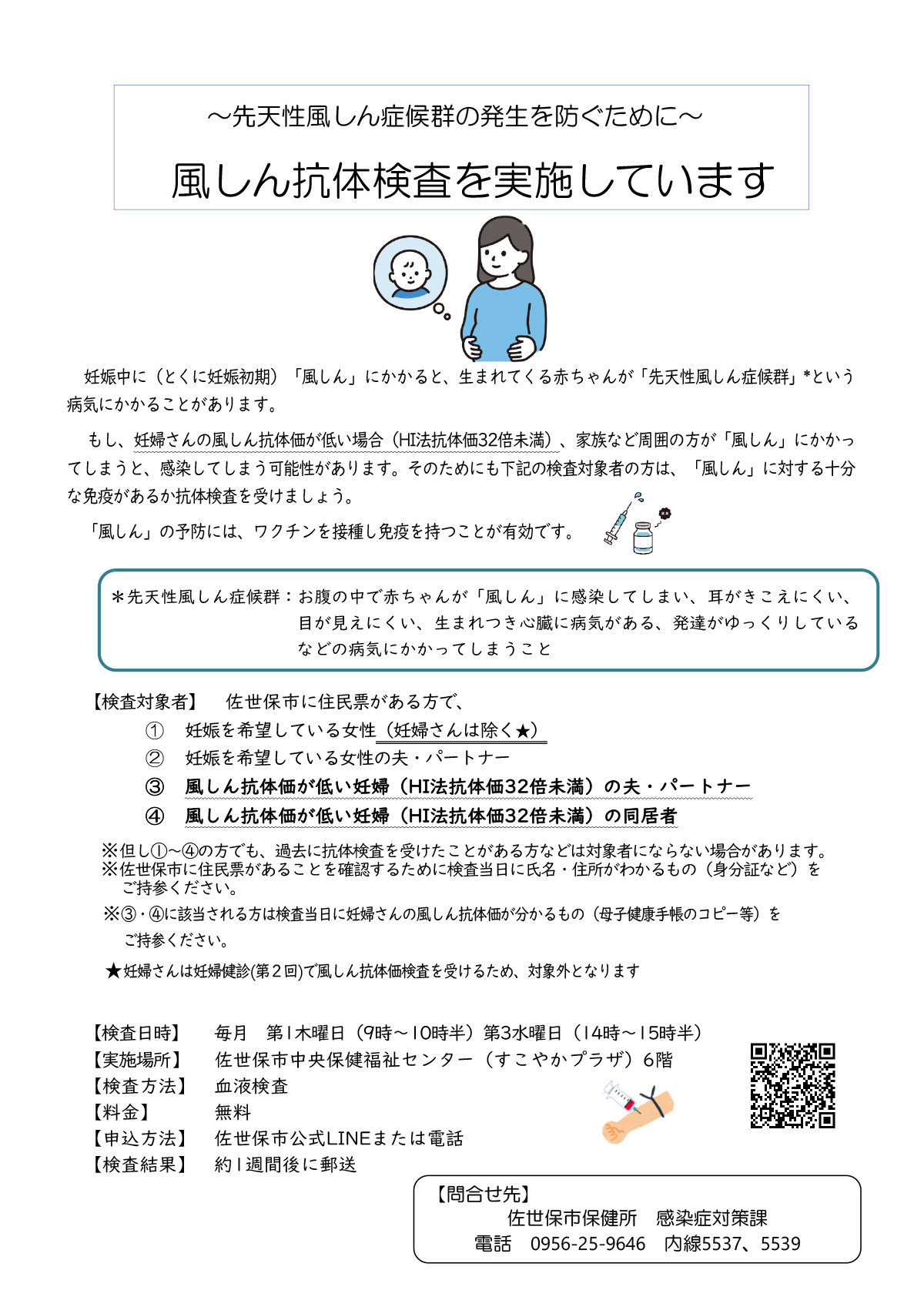 風しん抗体がない妊娠中(特に初期)の女性が風しんにかかると、生まれてくる赤ちゃんに先天性風しん症候群(難聴、心疾患、白内障等の症状)が現れることがあるんです。佐世保市では、先天性風しん症候群を予防するための対策として、風しん抗体検査を無料で実施してくれます。検査の結果、抗体の量が十分でない場合はワクチン接種をご案内します。