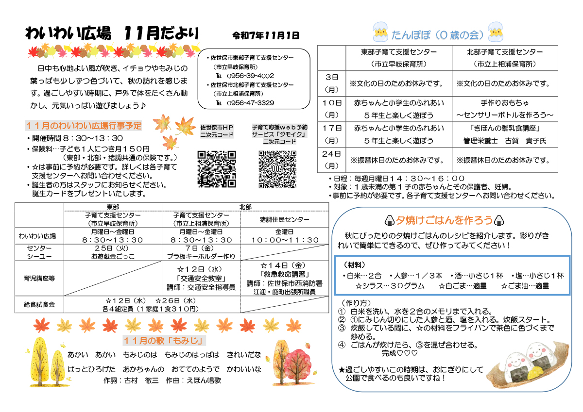 佐世保市のある子育て支援センターが発行している、イベントカレンダーです♪初めてママもパパも安心♪ 0才~就学前のお子さんも持つ親子が遊べる場所ですよ。担当の保育士さんもいるので、きょうだいでのびのび遊 ...